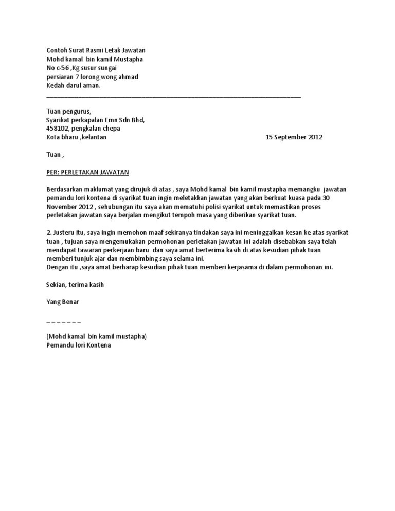 Ia merupakan contoh bagi semua jenis surat formal perletakan jawatan. 31/07/2021 · mungkin anda dalam proses pelatakan jawatan daripada syarikat lama anda. Nanti lah saya akan ceritakan kemudian apabila permohonan tersebut dah dapat kelulusan dan selesai. 21/09/2011 · format surat haruslah disusuli dengan sumber data yang tepat seperti nama,alamat dan tujuan anda mengarang. Hanya mengikuti beberapa format penulisan surat anda mampu menulis sendiri surat rasmi berhenti kerja.